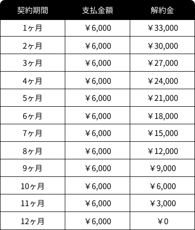 解約金につきましては下記表でご確認ください。