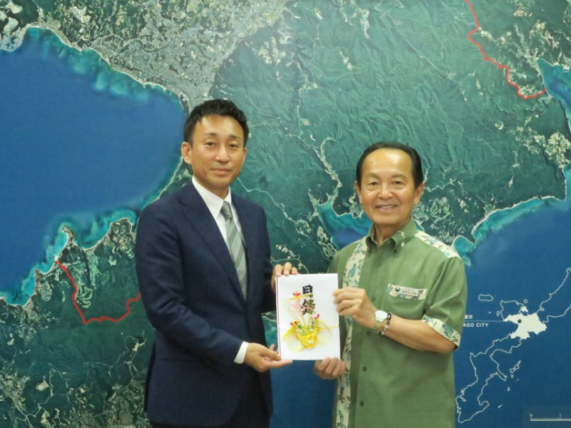 令和8年4月8日には寄附贈呈式が執り行われ、名護市長の渡具知様へ目録を贈呈いたしました。